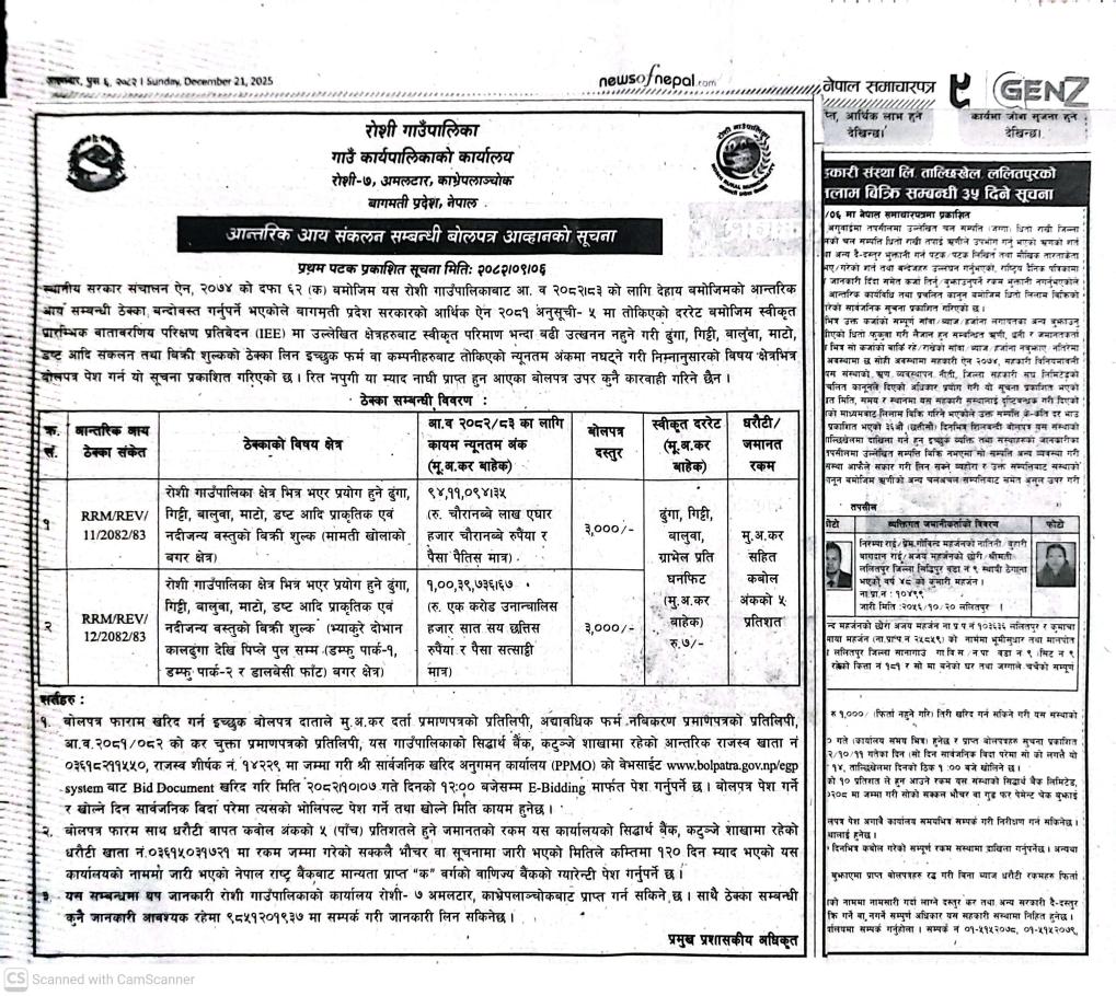 आन्तरिक आय संकलन सम्बन्धी बोलपत्र आव्हानको सूचना ।