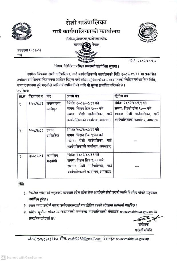 लिखित परीक्षा सम्बन्धी संसोधित सूचना ।